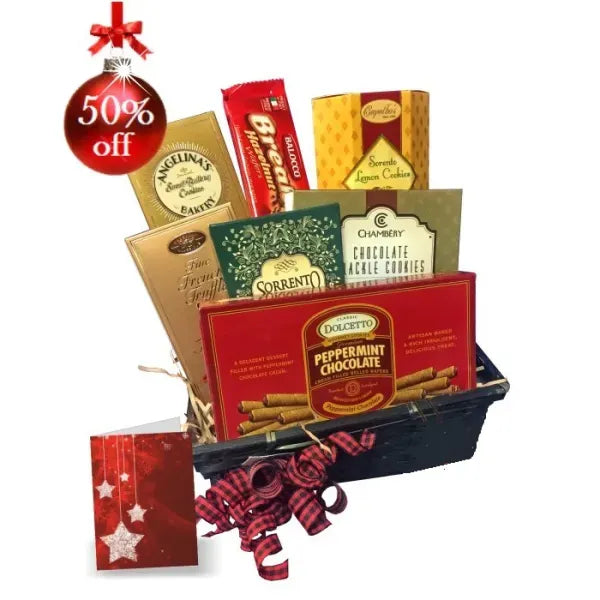 Our Gift Basket Gourmets have hunted down the most decadent treats ever and used them to create this Holiday theme gift basket full of tempting treats. Comprised solely of the most luxurious treats this completely irresistible vision of a gift basket is as good as it gets. Now we've taken it one step further and chopped the price in HALF! Call it what you will - we call it the Best Deal in Town - period.