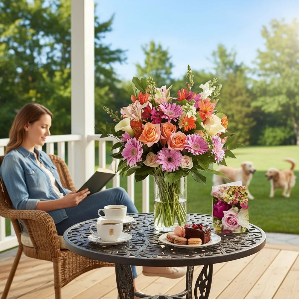 Bouquet includes Designers Collection of a beautiful mix of at least eighteen (18) stems; sixteen (16) stems of assorted, fresh cut flowers (or a single type of flower, like Roses) and two (2) stems of complementary filler-greens and a full size Greeting Card to put your thoughts to paper.