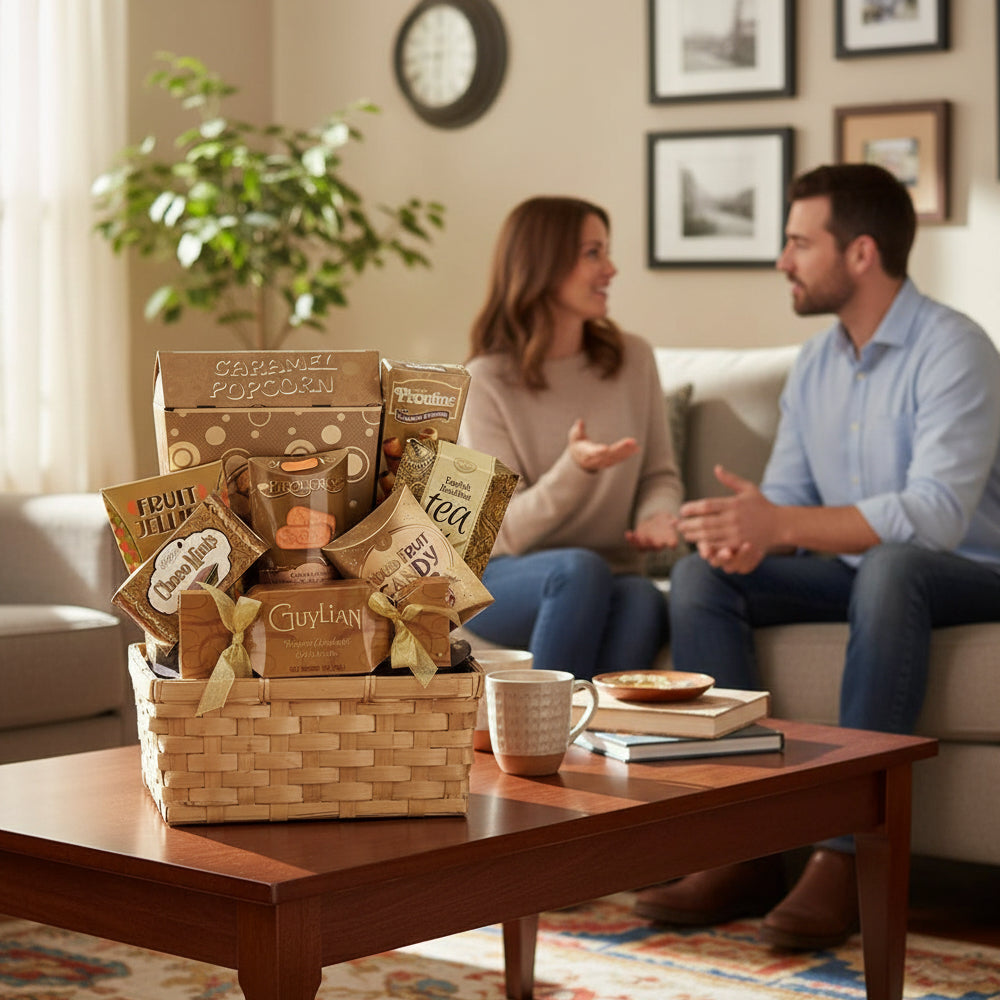 The "Holiday Tradition I" Gift Basket contains eight (8) gourmet items and includes any combination of the following gourmet treats; Chocolate Crackle Cookies, Roasted Almonds, Chocolate Salted Caramel Cookies, Salt Water Taffy, Caramelized Belgian Cookies, Wolfgang Puck Euro Style Coffee, Lindt Lindor Milk Chocolate, Three Pepper Blend Water Crackers, Hardwood Smoked Oysters in Sunflower Oil, Cafe Latte Barista Blend, Belgian Truffles, Dark Chocolate Truffles, Highland Select Tea, Sweet Butter Cookies, Baci Chocolate Pralines, Wild Freshwater Tuna, Mild Quebec Cheddar Cheese, Chocolate Covered Graham Crackers, Napa Valley Honey Mustard Sourbough Nuggets, Chocolate Wafer Cookies, OKA Cheese, Almond Roca Toffee, Wild Pacific Pink Salmon, California Rail Fruit Candy, Primo Dolce Truffle Cookies, Balderson Royal Canadian Cheddar Cheese, Chocolate Milano Biscotti, Dark Chocolate Bars and Lindt Excellence DARK Chocolate.