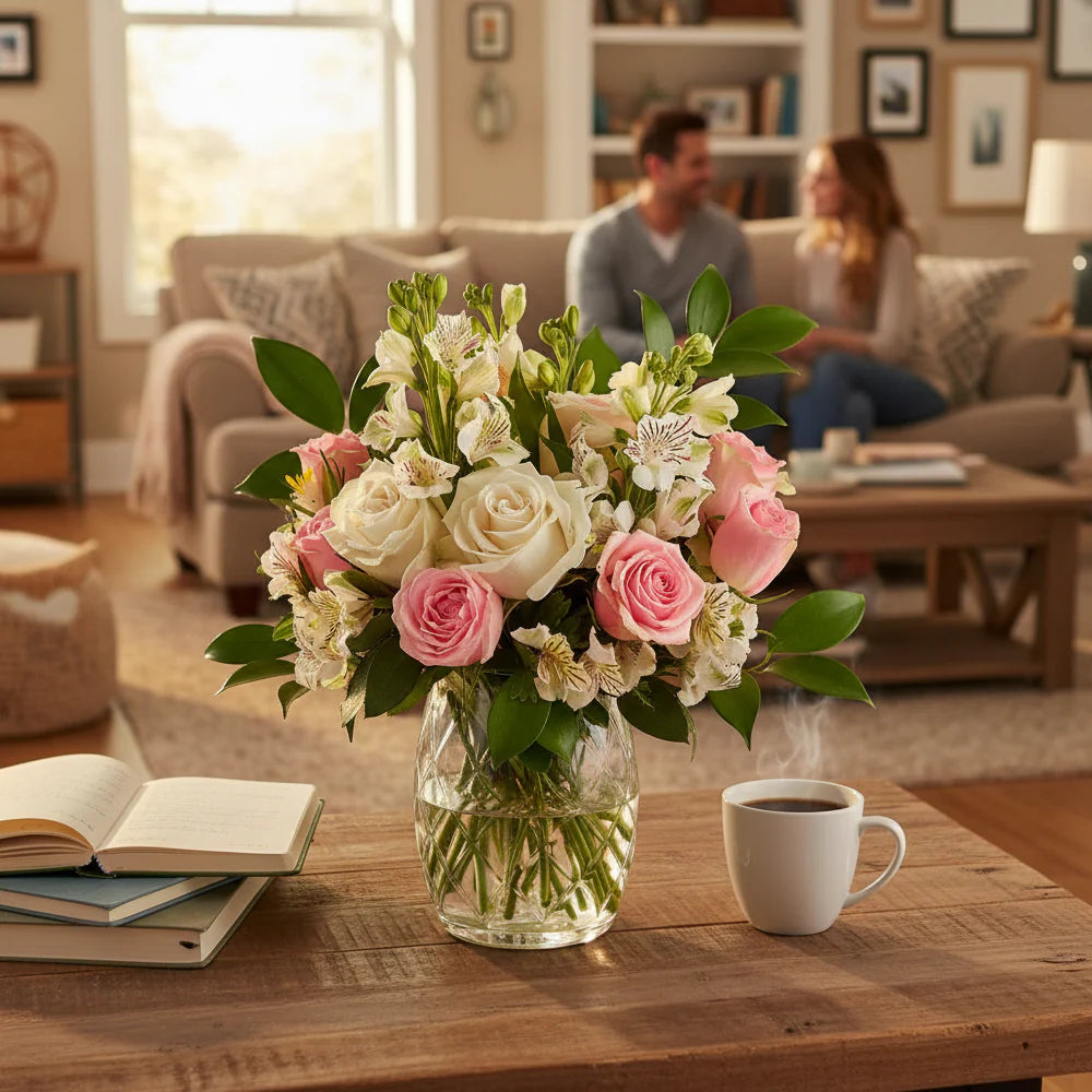 Discover our enchanting bouquet featuring plump White and Pink Roses, delicate White Alstroemeria, and complementary White Snapdragons! Radiating elegance and charm, this stunning arrangement is sure to captivate any recipient. Whether celebrating a special occasion or simply sending a thoughtful gesture, these exquisite blooms convey beauty and grace with every stem. Make a lasting impression with this subtle blend of colors and fragrances. Order now and add a touch of sophistication to any moment!