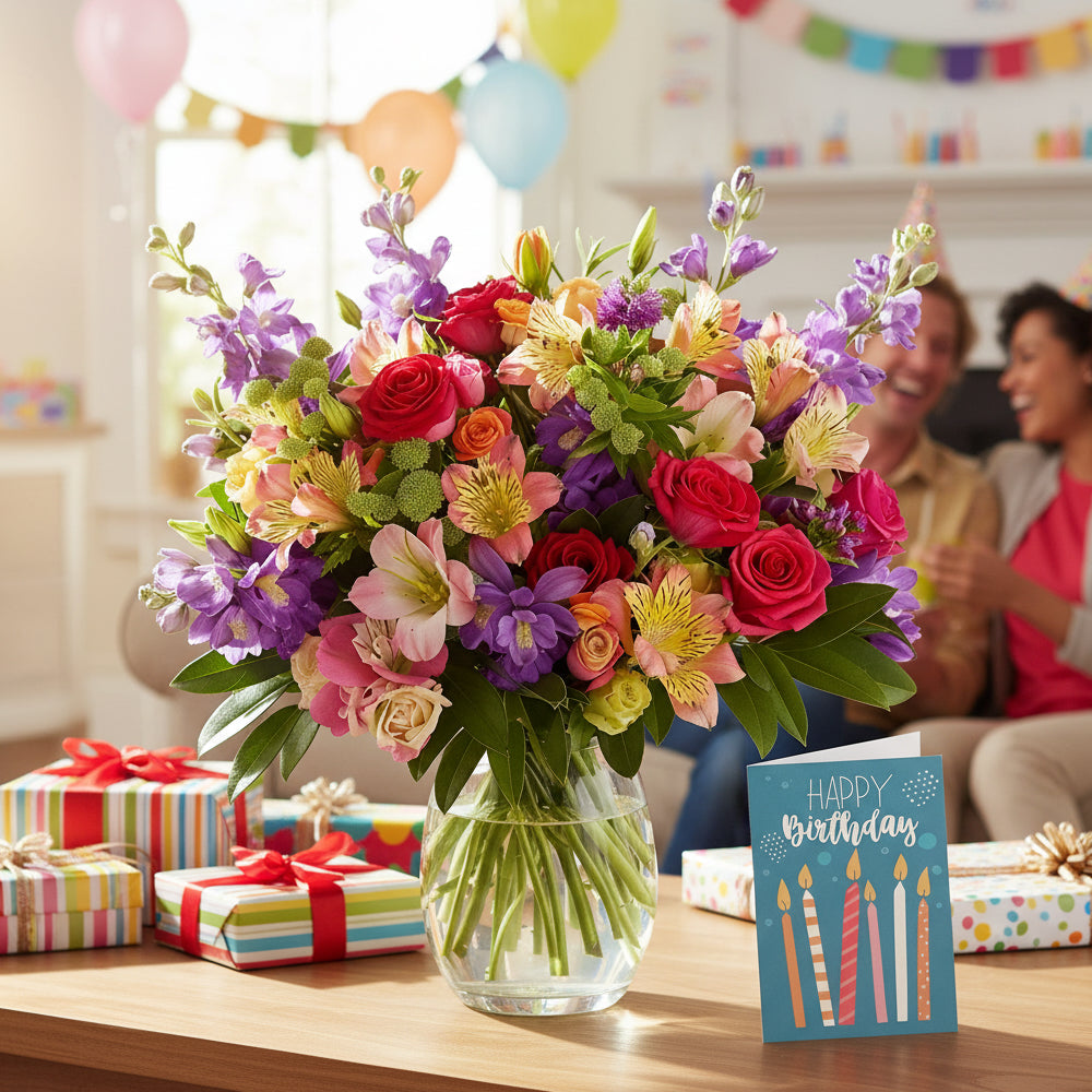 Special Birthday Package includes Designers Collection of a beautiful mix of at least twenty-four (24) stems; twenty-one (21) stems of Premium assorted, fresh cut flowers (or a single type of flower, like Red Roses, Calla Lilies or Gerber Daises) and three (3) stems of complementary filler-greens and a full size greeting card to put your Birthday Wishes to paper.