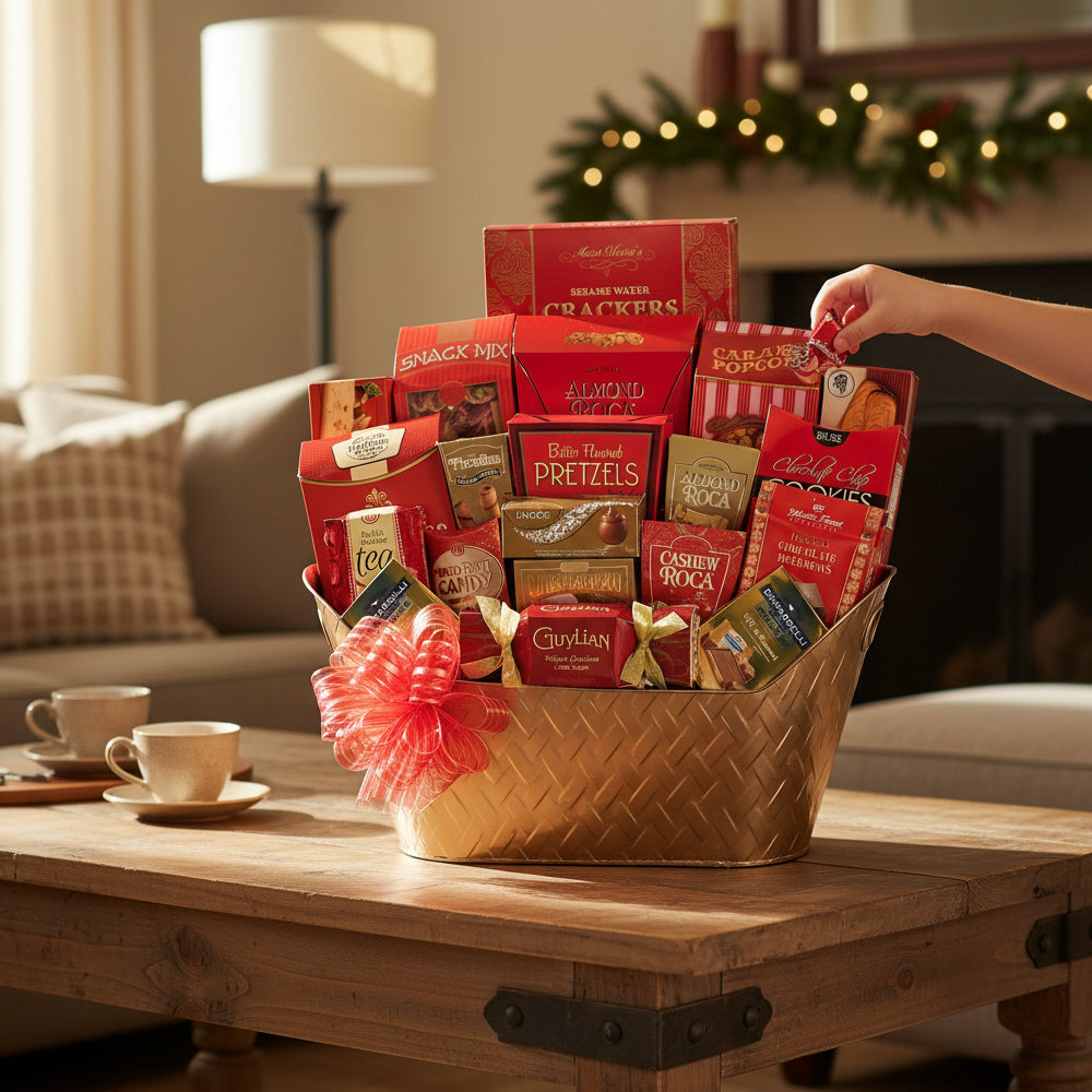 The "Holiday Tradition VIII" Gift Basket contains twenty-four (24) gourmet items and includes any combination of the following gourmet treats; Chocolate Crackle Cookies, Roasted Almonds, Chocolate Salted Caramel Cookies, Salt Water Taffy, Caramelized Belgian Cookies, Wolfgang Puck Euro Style Coffee, Lindt Lindor Milk Chocolate, Three Pepper Blend Water Crackers, Hardwood Smoked Oysters in Sunflower Oil, Cafe Latte Barista Blend, Belgian Truffles, Dark Chocolate Truffles, Highland Select Tea, Sweet Butter Cookies, Baci Chocolate Pralines, Wild Freshwater Tuna, Mild Quebec Cheddar Cheese, Chocolate Covered Graham Crackers, Napa Valley Honey Mustard Sourbough Nuggets, Chocolate Wafer Cookies, OKA Cheese, Almond Roca Toffee, Wild Pacific Pink Salmon, California Rail Fruit Candy, Primo Dolce Truffle Cookies, Balderson Royal Canadian Cheddar Cheese, Chocolate Milano Biscotti, Dark Chocolate Bars and Lindt Excellence DARK Chocolate.