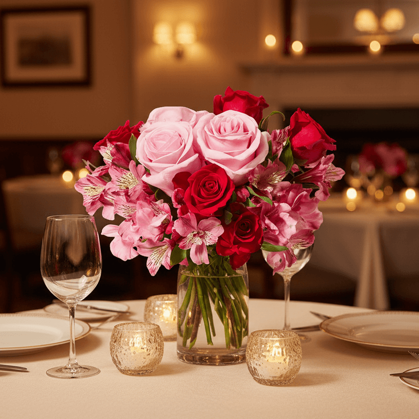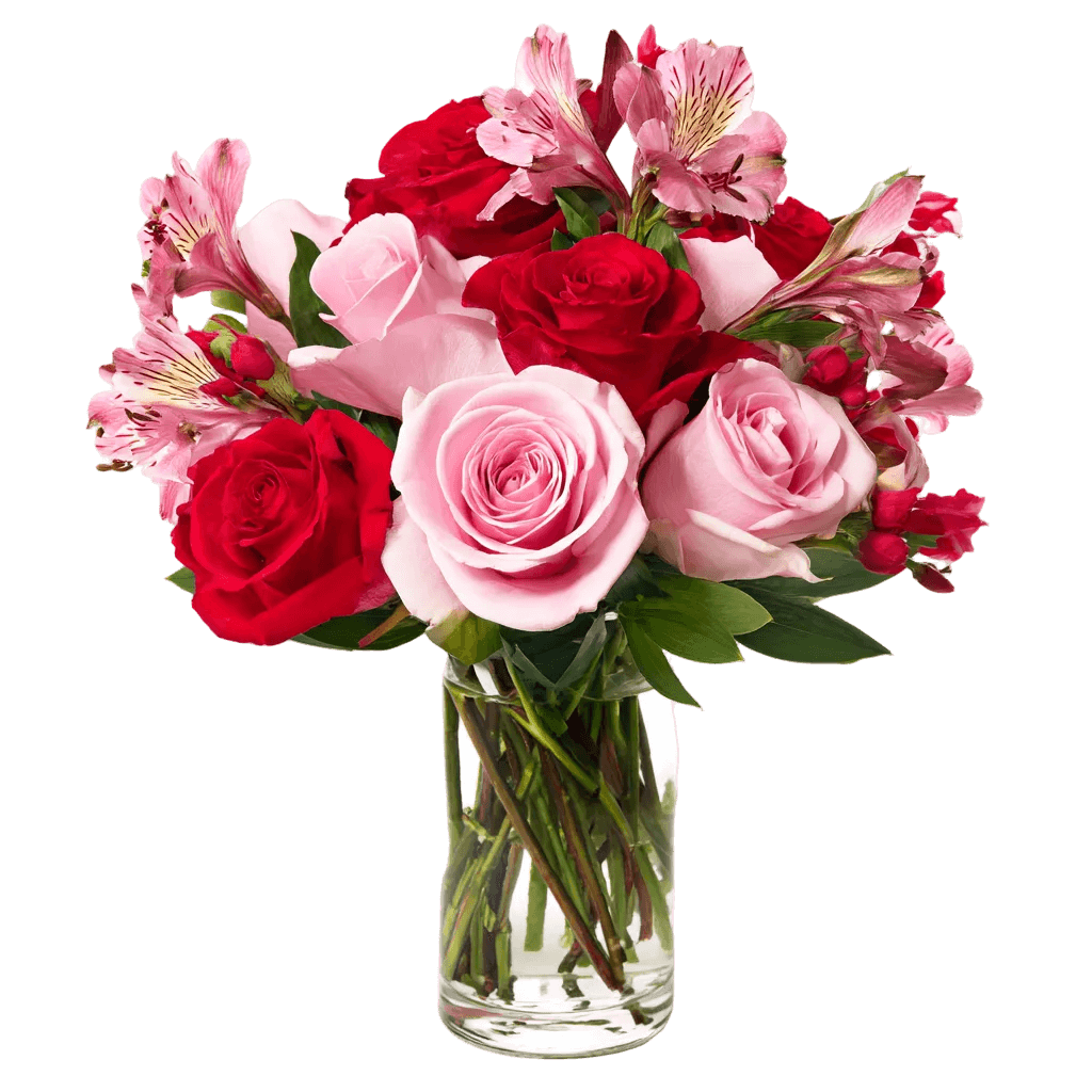 What you're getting: A generous hand-tied arrangement featuring mixed roses , pink alstroemeria, and fresh ruscus. Presented in a red flower box and wrapped in cellophane.